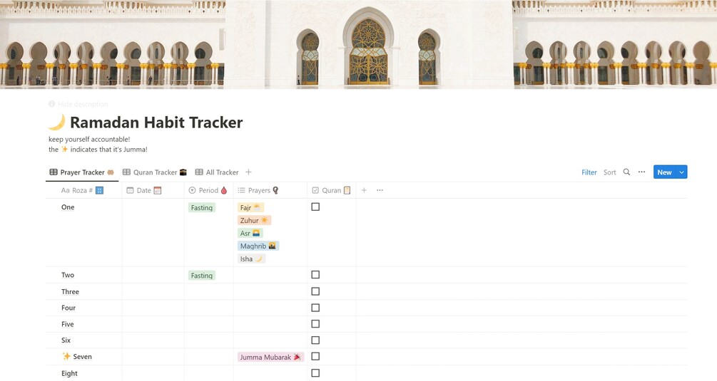 Ramadan Kareem! It's that time of the year again when we get to focus on our spiritual growth and establish healthy habits. But let's be real, it can be overwhelming to keep track of everything on our own. That's where this super cute and easy-to-use Notion template comes in handy! Keep track of your fasts, prayers, and Quran reading with just a few clicks.